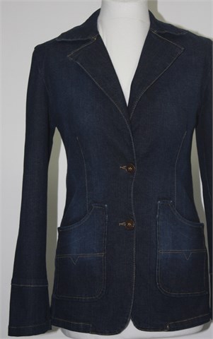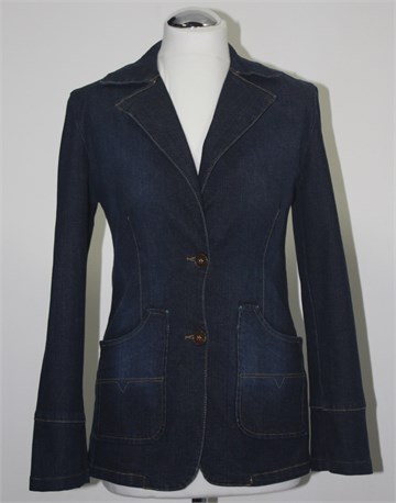 Oops traper sako (ili jakna) tamnije plave boje mjestimično ispranog izgleda (tvornički). Prednje kopčanje na dva gumba, bočni džepovi. Prednji i stražnji ušitci (strukiran). Na krajevima rukava mali rasporci, rasporak i sa stražnje strane. Rastezljiv traper.