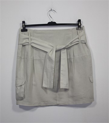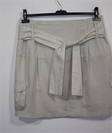 Oops suknja svijetlo bež boje, odlična kombinacija lana i pamuka. Bočni cif i kopčica, šira pasica za remen sa pripadajućim remenom. Džepovi pri dnu suknje (jedan ukrasni). Lagan i prozračan materijal.