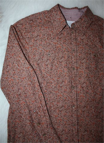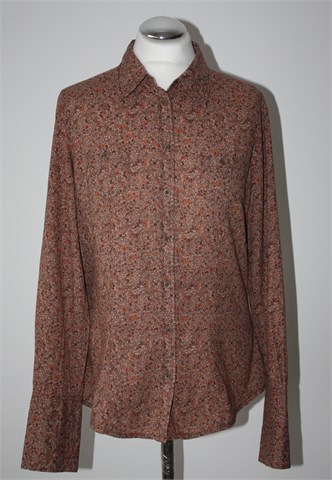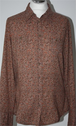 Opus košulja sa dugim rukavima, smeđe boje sa sitnim cvjetnim printom (vidljivo na slikama). Prednje kopčanje, na prsima džepići sa gumbom (sva svake strane jedan). Nije rastezljiva.