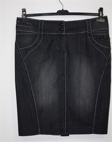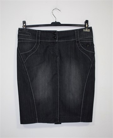 Opus traper suknja, tamije sive boje mjestimično ispranog izgleda (used look). Prednji cif i kopčanje, šira pasica za remen. Prednji i stražnji džepovi, mali stražnji rasporak sa faldom. Blago rastezljiva.