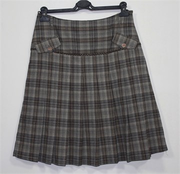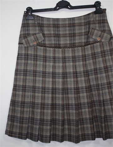 Orlando suknja u pretežno smeđe-crno-bež tonovima s uzorkom (kao na slikama), mjestimično protkana sjajnim nitima. Bočni cif, ušice za remen. Ukrasni džepovi sa prednje strane, falde sa obje strane. Podstavljena, blago rastezljiva.