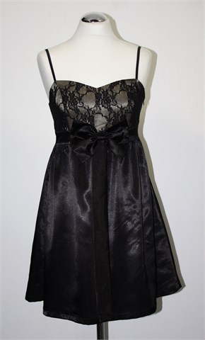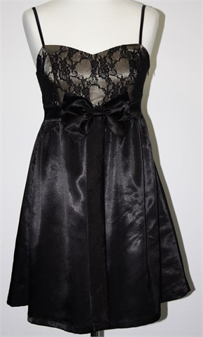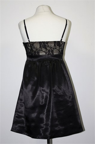 Orsay haljina sa tankim, podesivim naramenicama (regulacija kao na grudnjaku), crne boje. Gornji dio (podstava) zlatno-bež boje presvućen čipkastim materijalom crne boje, u struku ukrasna mašna. Bočni cif, podstavljena.