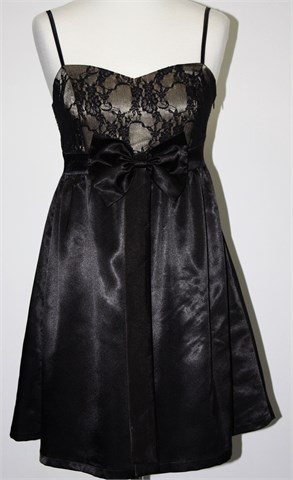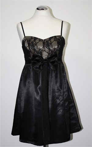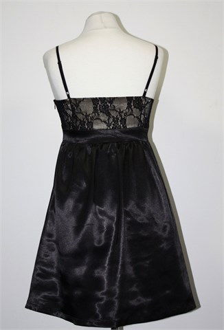 Orsay haljina sa tankim, podesivim naramenicama (regulacija kao na grudnjaku), crne boje. Gornji dio (podstava) zlatno-bež boje presvućen čipkastim materijalom crne boje, u struku ukrasna mašna. Bočni cif, podstavljena.