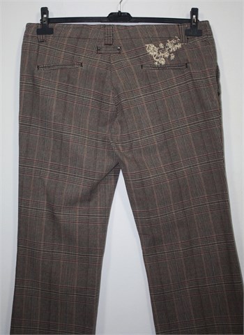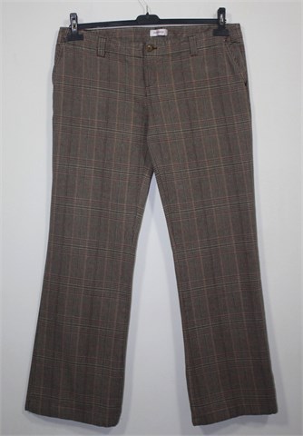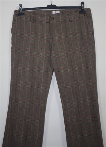 Orsay hlače smeđe boje sa prugasto-kariranim uzorkom (boje i uzorak kao na slikama). Prednji cif i kopčanje, pasica za remen. Prednji bočni, stražnji skriveni džepovi (aplikacija iznad stražnjeg džepa). Deblji i mekan pamuk.