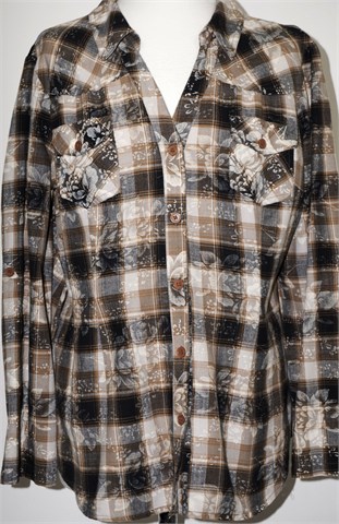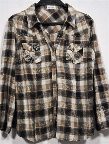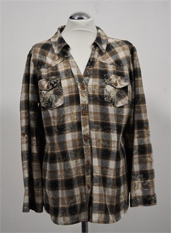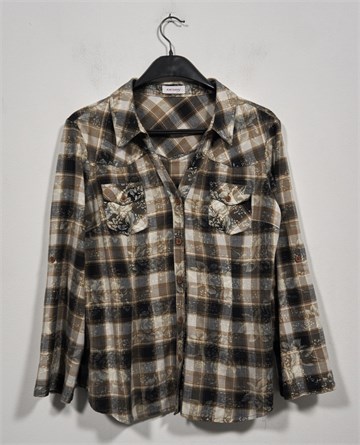 Orsay košulja sa poludugim rukavima (mogu se nositi i kao kraći - vanjski gumbić i vezica unutar rukava), smeđe-bež boje sa prugasto-kariranim uzorkom i printom (kao na slikama). Prednje kopčanje, džepići sa preklopom i gumbom na prsima. Mali bočni prorezi, bočne ušice za remen. Mekana i nerastezljiva.