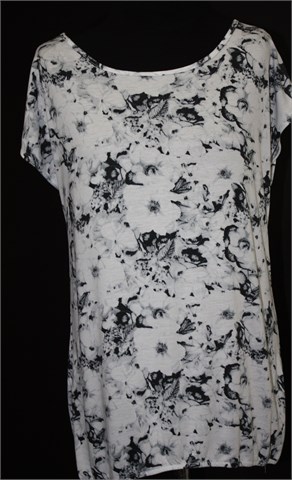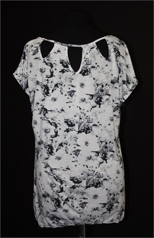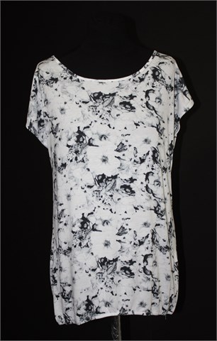 Orsay majica sa kratkim rukavićima, bijele boje sa crno-sivim cvjetnim printom (uzorak kao na slici). Gumica u pasici, mali otvori sa stražnje strane. Mekana i rastezljiva.