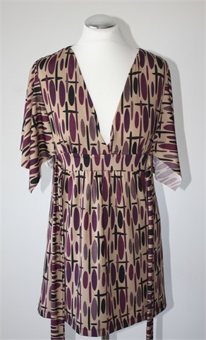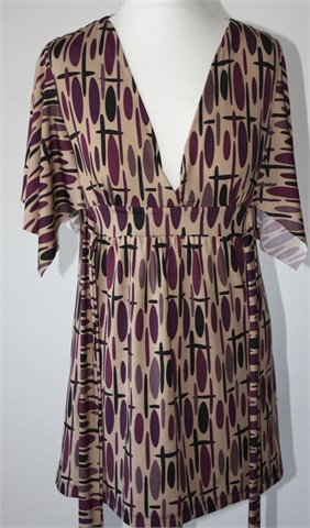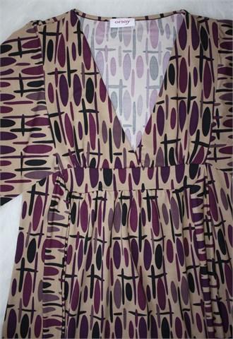 Orsay majica/tunika sa kratkim rukavima (rukavići su široki i imaju izrez umjesto unutarnjeg šava kod pazuha), bež boje sa printom (boje i uzorak printa vidljivi na slikama). Trake za vezanje, mekana i vrlo rastezljiva.