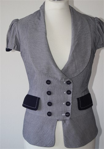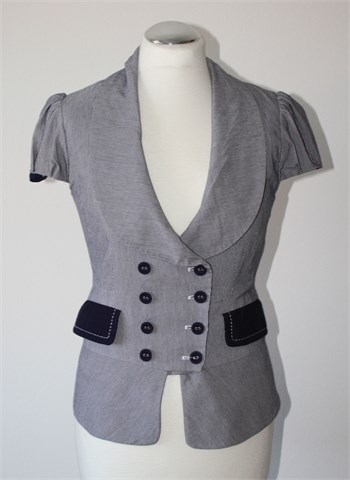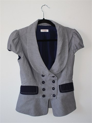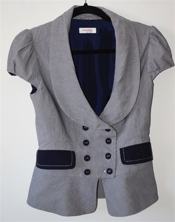 Orsay sako/jakna sa kratkim pufastim rukavima, prugasta kombinacija plave i bijele boje (mornarski stil). Prednje kopčanje sa 4 gumba (mogućnost kopčanja i sa dva unutarnja gumba, odšili su se i lako se zašiju neki zamjenski), bočni džepovi sa preklopom. Strukirana, podstavljena. Blago rastezljiva.