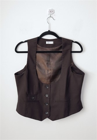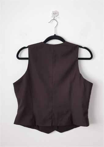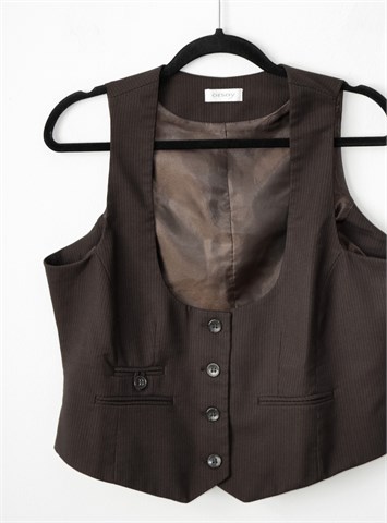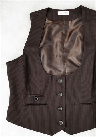 Orsay prsluk tamno smeđe boje sa svjetlijim prugama. Prednje kopčanje, strukiran. Bočni ukrasni džepići, podstavljen.