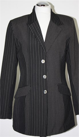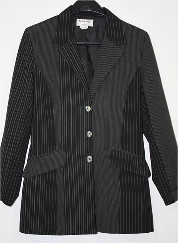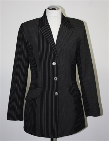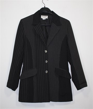 Orsay vintage duži sako, crne boje sa bijelim prugicama. Prednje kopčanje sa ukrasnim gumbima, bočni džepovi sa preklopom. Jastučići u ramenima, podstavljen. Strukiran.