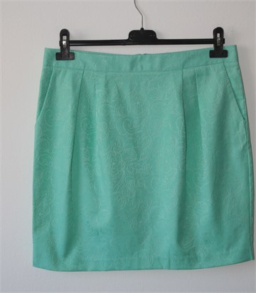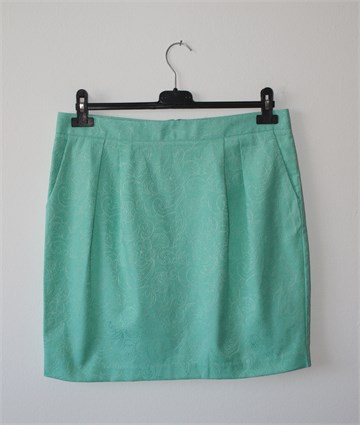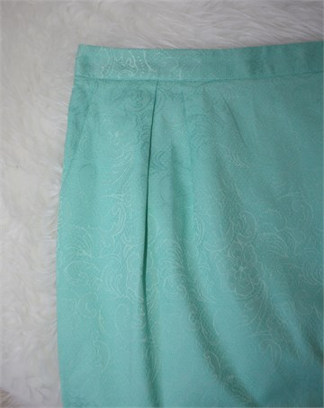 Orsay suknja pastelno svijetlo mint zelene boje sa žakard uzorkom (blago sjajnim). Prednji bočni džepovi i prošivi, stražnji cif i kopčica. Blago rastezljiva.