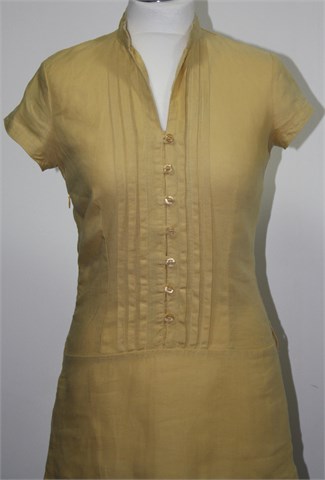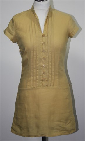 Orsay tunika zagasito žute boje. Prednje kopčanje i ukrasne faldice. Ušice za remen, bočni cif. Kratki rukavi. Čvrst ali lagan materijal, nije rastezljiv.
