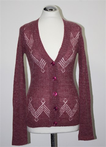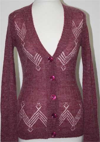 Orsay vesta sa kopčenjem/kardigan prošarano rozo-ljubičasto-bijele boje. Prednje kopčanje, mjestimični rupičasti uzorak. Tanje, mekano, mucasto i rastezljivo pletivo.