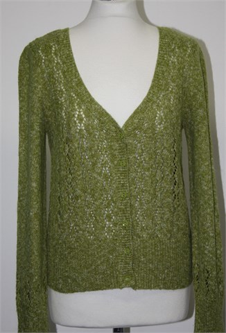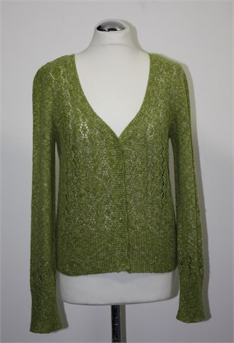 Orsay vesta sa kopčanjem/kardigan prošarano zeleno-bijele boje. Sa prednje strane i na krajevima rukava rupičasto pletivo (providno). Mekano i rastezljivo pletivo (par čvoriča u pletenju ali ništa primjetno jer je vestica prošarana).