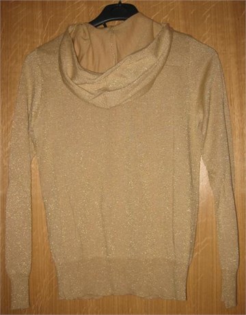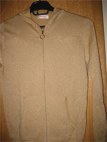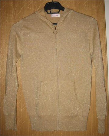Lagana vesta na cif, sa kapuljačom. Bež boje, kroz cijelu vesticu utkane zlatne niti pa djeluje kao da je cijela zlatna. Prednji džepovi. Rastezljiva.