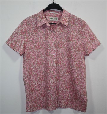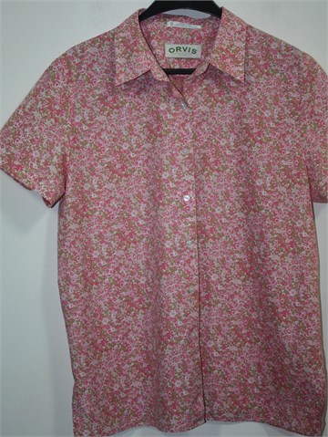 Orvis košulja sa kratkim rukavima, bijele boje sa cvjetnim printom (boje kao na slici). Prednje klasično kopčanje, mali bočni prorezi. Predivan, kvalitetan pamuk, nije rastezljiv.