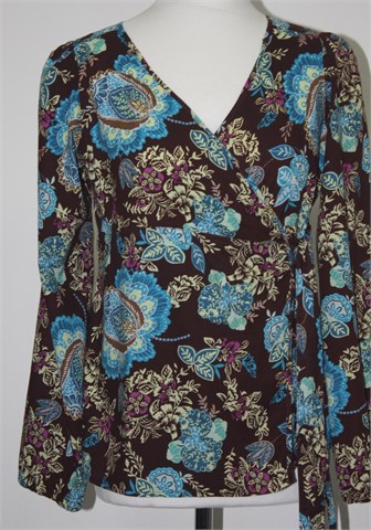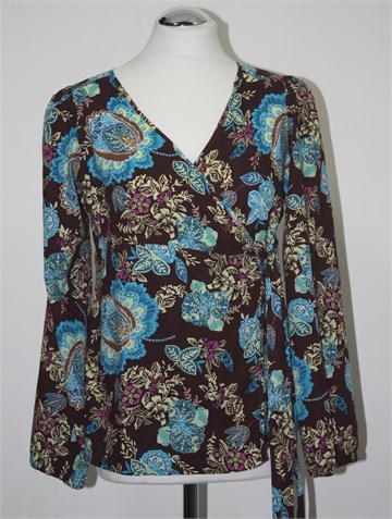 Outfit košulja sa dugim rukavima i preklopom, tamno smeđe boje sa šarenim cvjetnim printom. Preklop se namješta pomoću gumbića sa unutarnje strane i bočnih špagica. Na krajevima rukava su uvedene gumice. Lagana i prozračna.