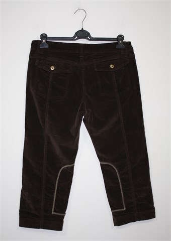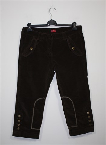 Outfit poluduge hlače od pliša tamno smeđe boje, mekan i rastezljiv materijal. Pprednji cif i kopčanje, pasica za remen. Prednji i stražnji džepovi na preklop sa gumbom. Sa vanjske strane nogavica po četiri gumba.