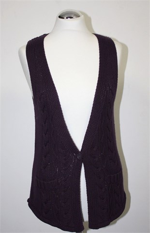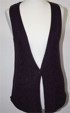 Outfit vesta/kardigan bez rukava, tamnije zagasito ljubičaste boje. Prednje kopčanje sa jednim gumbom, ukrasni bočni džepovi. Uzorak pletenica sa prednje strane. Pletivo je srednje debljine, mekano i rastezljivo.