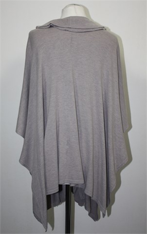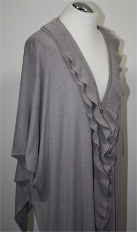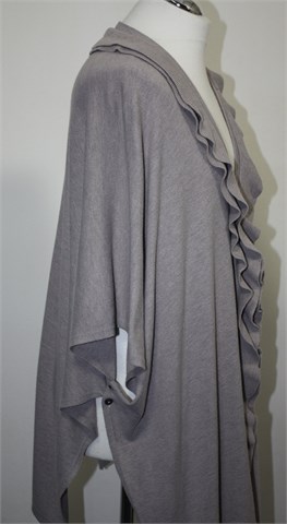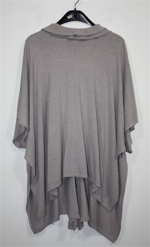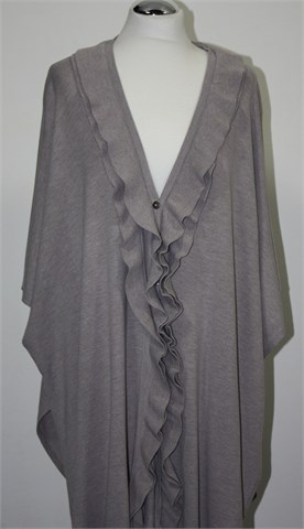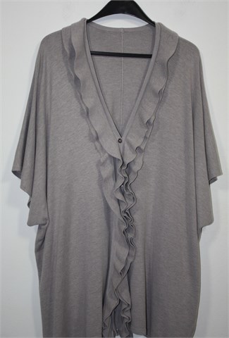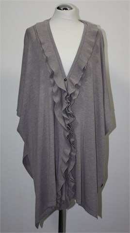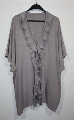 Vesta sa prednjim kopčanjem na tri gumbića, boja je nedefinirana i neutralna sivo-bež nijansa. Rukavi su kratki sa vrlo širokim otvorima (kada je vesta obućena rukavi se malo preklope pa ispadaju duži). Ispod pazuha kopčanje sa dva gumbića, volančić sa prednje strane. Kada je obućena dužina ispada asimetrična a model je oversized koji mora malo biti prevelik da stoji onako kako treba :) Materijal je mekan i tanji, vrlo rastezljiv.