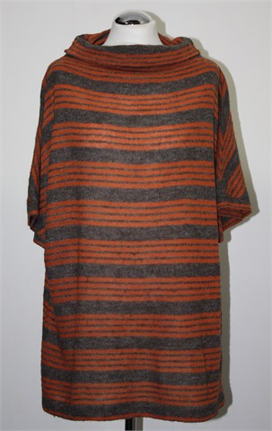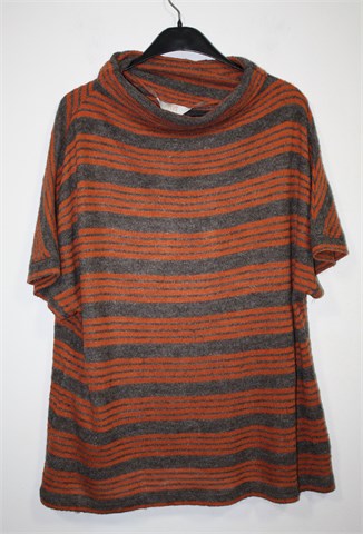 Oviesse Plus vesta/poludolčevita sa kratkim rukavima, prugasta kombinacija sive i narančaste boje. Tanje, mekano i blago mucasto pletivo. Rastezljiva.