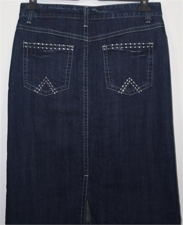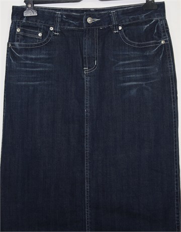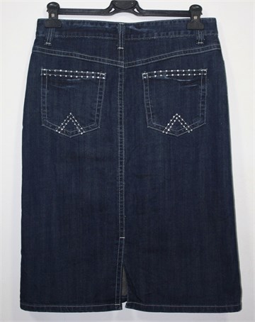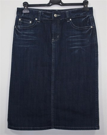 Oviesse traper suknja tamnije plave boje mjestimično ispranog izgleda (tvornički used look). Prednji cif i kopčanje, pasica za remen. Prednji i stražnji klasični džepovi (stražnji ukrašeni cirkonima). Stražnji rasporak (po sredini), vrlo blago rastezljiva.
