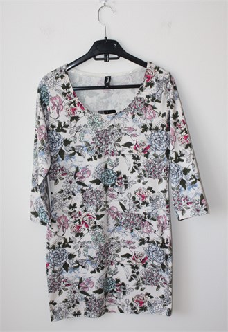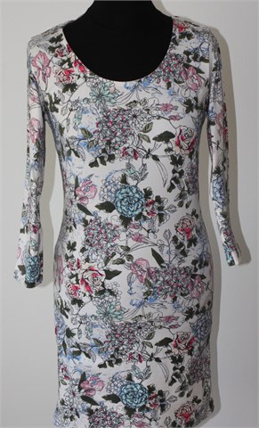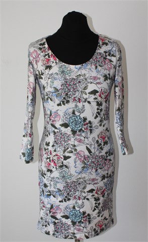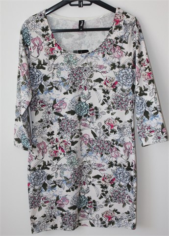Page One (Takko) haljina sa poludugim rukavima, podloga je svijetlo nude boje sa šarenim cvjetnim printom (boje i uzorak printa vidljivi na slikama). Mekana i rastezljiva.