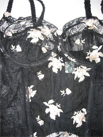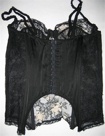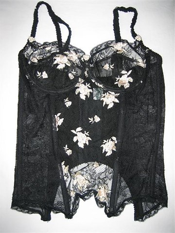 Korzet sa žicama, prednja strana prozirna čipka sa našivenim bijelim cvjetićima, bočni dio samo čipka bez aplikacija, žica ispod grudi, stražnja strana rastezljiva, prilagodljiva širina (tri reda kopčica kojima se određuje širina), čipkaste naramenice koje se mogu regulirati, košarice veličina grudnjaka 2, konfekcijski brojevi 36/38
