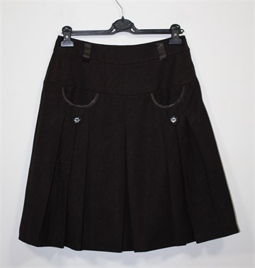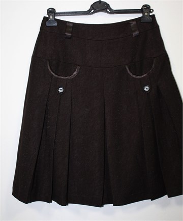 Paniz suknja sa faldama, tamno smeđe boje. Bočni cif i kopčica, pasica za remen. Sa prednje strane džepovi i ukrasni gumbi (rubovi džepova i ušice na pasici su od materijala nalik satenu). Materijal je deblji i težak, blago sjajan (ne jako kao na slici - slikano je sa blicom). Suknja je podstavljena.