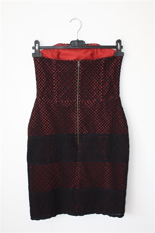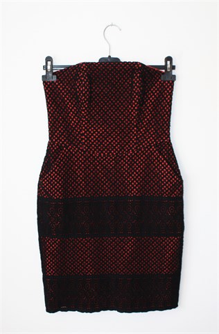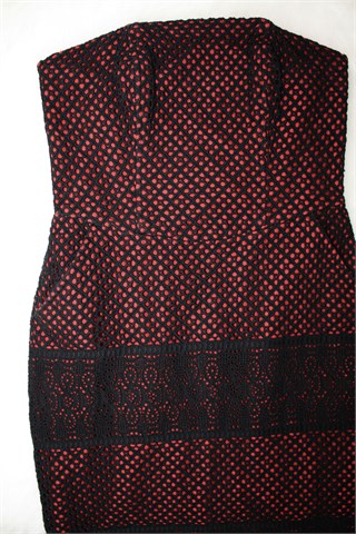 Papaya Occasionwear haljina crno-crvene boje. Vanjski dio haljine je pamučni rupičasti pleteni materijal crne boje, podstava/unutarnji dio haljine crvene boje (vidljiv ispod crnog sloja). Bez naramenica (postoje ušice za zakačiti naramenice, ne dolaze uz haljinu), plastične žice u gornjem dijelu. Prednji bočni džepovi, stražnji cif.
