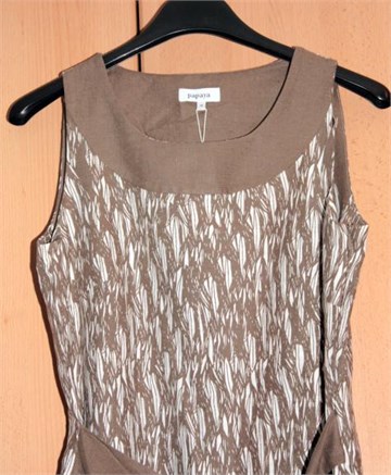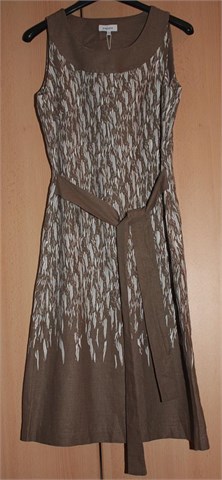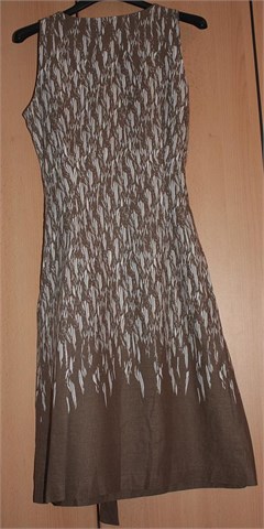 Haljina bez rukava, ušitci za grudi, blago strukirana. Bočni cif i našiven remen smeđe boje. Nije rastezljiva.