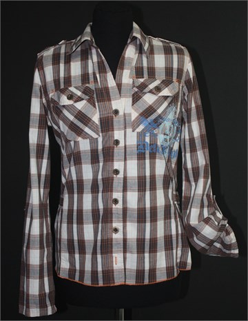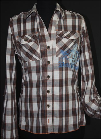 Papaya košulja sa dugim rukavima (pomoću unutarnje vezice i vanjskog gumbića mogu se nositi i kao kraći - kao jedan rukav na slici), bijele boje sa kariranim uzorkom u smeđoj i narančastoj boji. Prednje kopčanje, džepići na prsima. Bočne trake sa gumbima pa se može strukirati po želji. Prednji i stražnji print u plavoj boji.