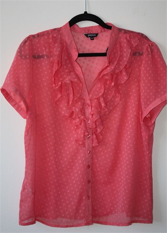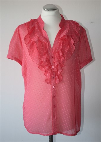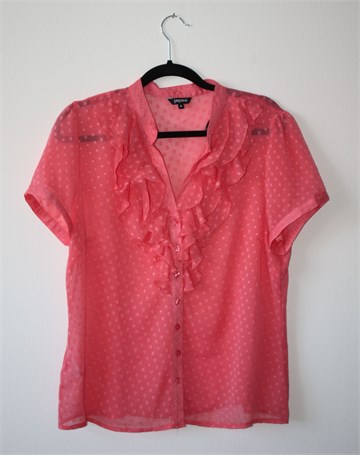 Papaya košulja sa kratkim rukavima, svijetle pastelno koraljno roze boje. Prednje kopčanje ukrašeno volančićima, uzorak točkica na materijalu. Tanja, lagana i providna. Vrlo blago rastezljiva.