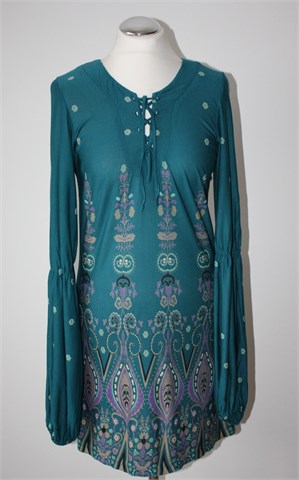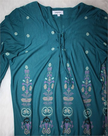 Papaya majica/tunika sa dugim rukavima, plavo-zelene boje sa prednjim printom (boje i uzorak printa vidljivi na slikama). Sa prednje strane vezanje (u gornjem dijelu), gumice na rukavu. Tanja i lagana, rastezljiva.