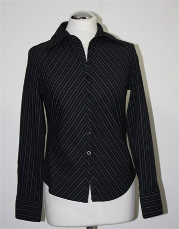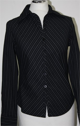 Pastorat košulja sa dugim rukavima, crne boje sa bijelim prugama. Prednje kopčanje, strukirana. Rastezljiva.