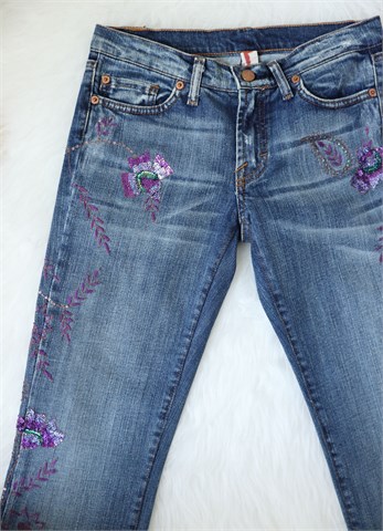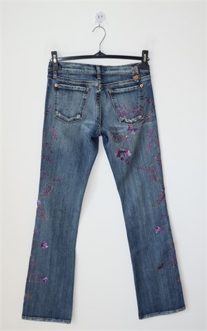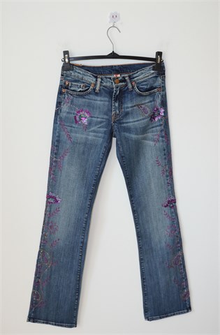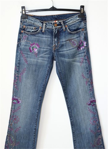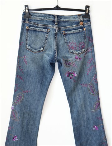 Peg traper hlače, srednje plave boje mjestimično ispranog i iscufanog izgleda (tvornički used look). Prednji cif i kopčanje, pasica za remen. Prednji i stražnji klasični džepovi. Ukrašene aplikacijama od konca i šljokica (vidljivo na slikama). Blago rastezljive.