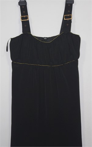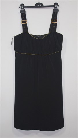 Pepe Jeans haljina bez rukava, crne boje sa zlatnim detaljima (model se zove Penny). Tanke naramenice sa rupicama i kopčicom (kao na remenu) pa se može prilagoditi dužina. Bočni cif, podstavljena cijelom dužinom.