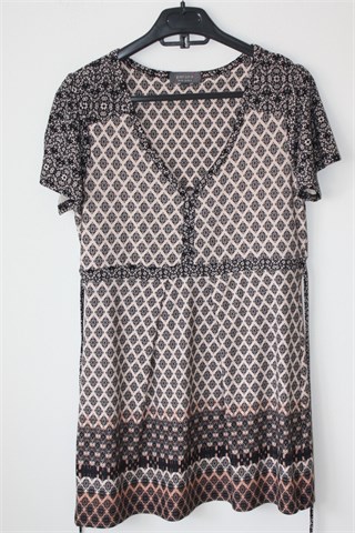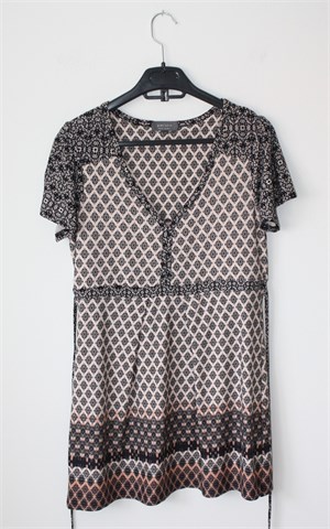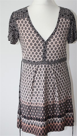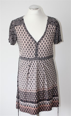 M&S Per Una majica/tunika sa kratkim rukavima, nude-roze boje sa printom (boje i uzorak printa vidjlivi na slikama). Bočne trake za vezanje, rastezljiva.