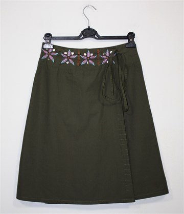 Personality suknja maslinasto zelene boje, sa prednje strane fiksni preklop (kopčanje sa unutarnjim gumbom, vezanje sa špagicama je fiksno). Na pasici ukrasne aplikacije, sa stražnje strane cif.