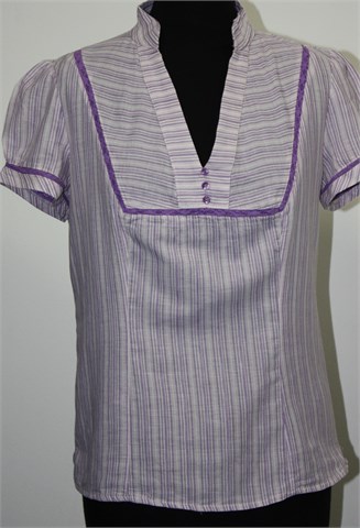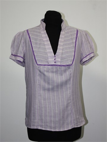 Pilar Prieto bluza sa kratkim rukavima, bijele boje sa ljubičasto-lila prugama. Bočni cif, ukrašena ljubičastim heklanim trakicama (oko dekoltea i rubova rukava). Tanji i mekan pamuk, lagan i prozračan.