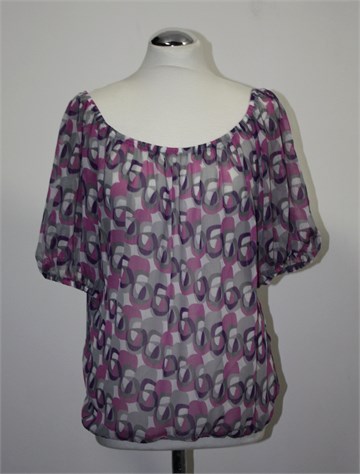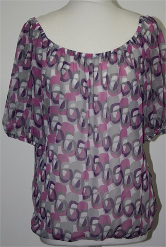 Pimkie bluza sa kratkim rukavima, šareni uzorak (boje i uzorci kao na slici - kombinacija sive, bijele, roze i ljubičaste boje). Ušivena gumica u pasici, oko prednjeg otvora i ruba rukava. Lagana i prozračna, providna.