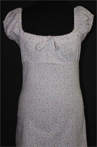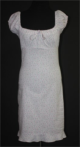 Pimkie haljina sa kratkim rukavima, bijele boje sa sitnim cvjetnim printom u rozoj i zelenoj boji. Rezana ispod grudi, dekolte obrubljen rastezljivom gumicom i pasicom sa špagicom. Na dnu haljine ja mali volančić. Stražnji cif. Materijal je čvrst i rastezljiv.