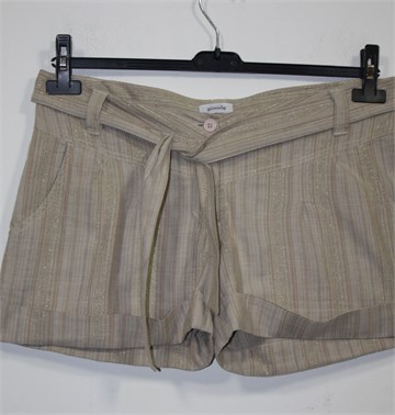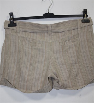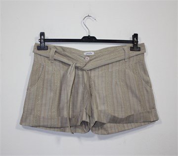 Pimkie kratke hlače bež boje sa prugama (mjestimično su pruge zlatne pa su i blago šljokave). Prednji cif i kopčanje, pasica za remen sa pripadajućim remenom (može se skinuti). Prednji i stražnji džepovi. Lagan i prozračan materijal.