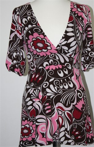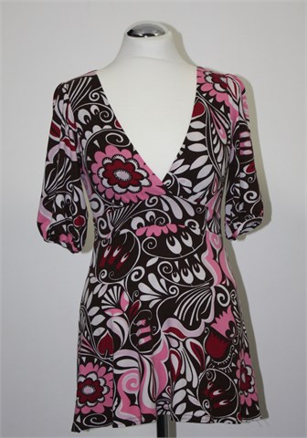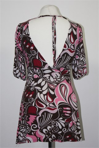 Pimkie majica sa poludugim rukavima, tamno smeđe boje sa šarenim printom (boje i uzorak printa vidljivi na slikama). Prednji i stražnji otvor, vezanje sa stražnje strane (vidljivo na slici). Mekana i rastezljiva.