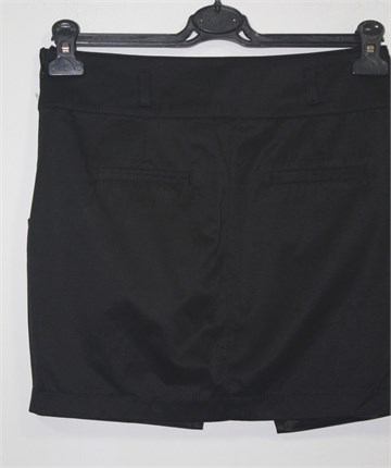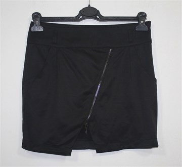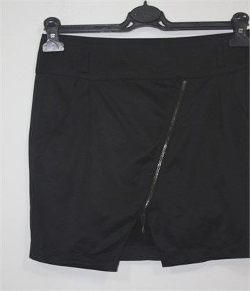 Pimkie suknja crne boje sa prednjim ukrasnim cifom (cif je funkcionalan ali je dio ispod cifa zašiven). Bočni cif i kopčica, pasica za remen. Bočni džepovi, stražnji samo ukrasni. Dvije prednje faldice. Materijal je gladak i blago sjajan, nije rastezljiv.