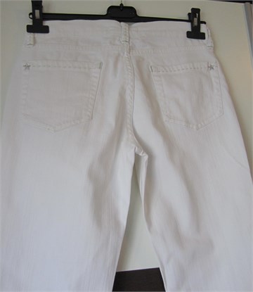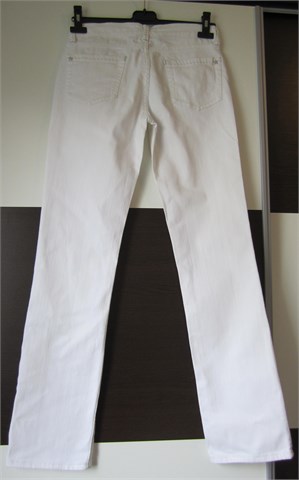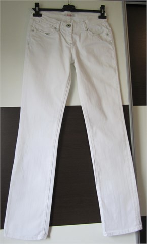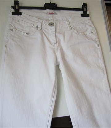 Pimkie traper hlače bijele boje, s ukrasnim prošivima od srebrnog konca. Hlače imaju prednji cif i kopčanje, pasicu za remen. Prednji i stražnji klasični džepovi. Blago rastezljive.