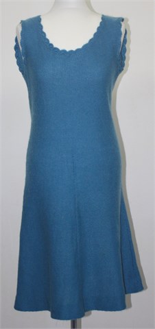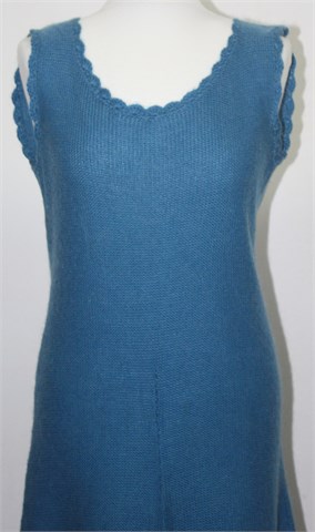 Pletena haljina bez rukava, boja je prošarano plava. Detalji oko rukava i dekoltea. Mekano, mucasto i rastezljivo pletivo.