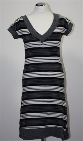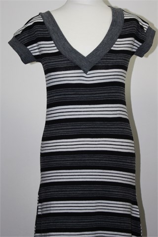 Pletena haljina/tunika sa kratkim rukavima, prugasta kombinacija bijele, sive i crne boje. Tanje, mekano i vrlo rastezljivo pletivo.