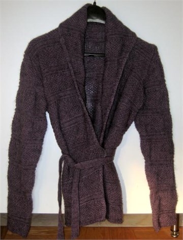 Vesta na vezanje tamno ljubičaste boje. Lagano pletivo, blago rupičasta.