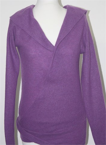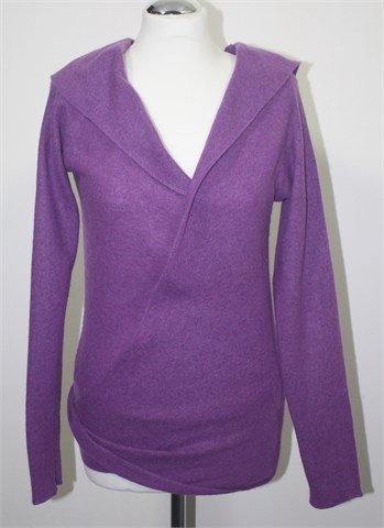 Point vesta na preklop i vezanje, prošarano svijetlo ljubičaste/lila boje. Mekano, mucasto i rastezljivo pletivo.